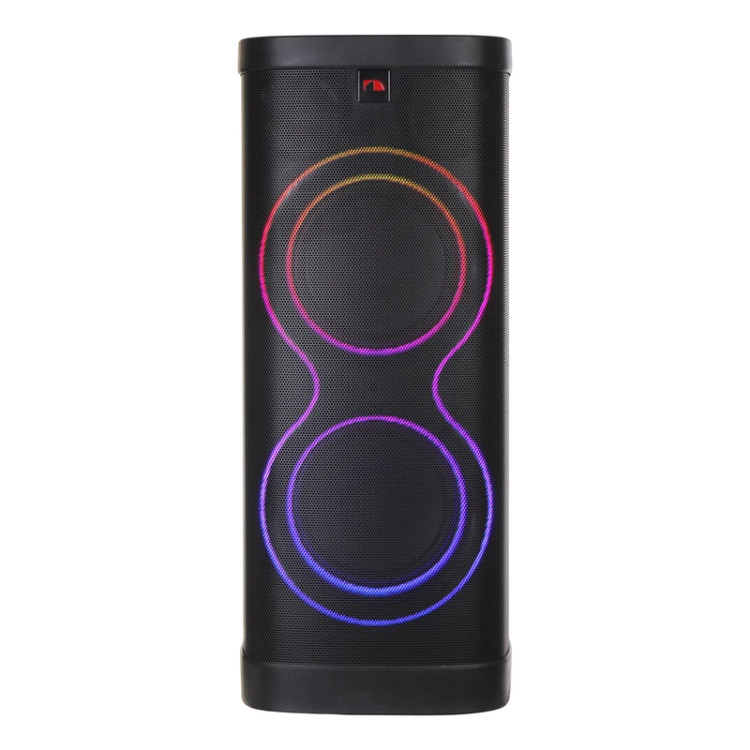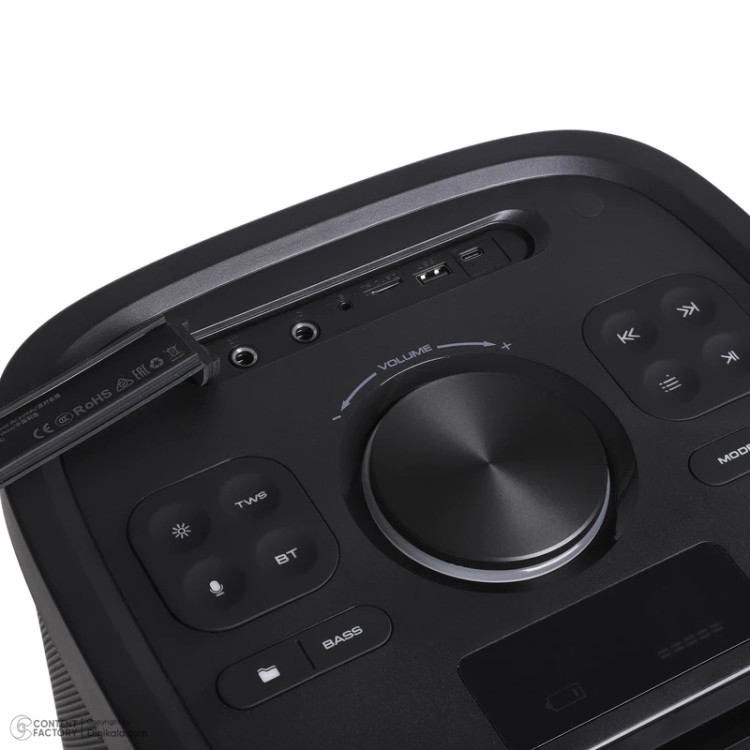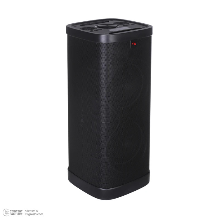 CONCERT 825 از لحاظ ابعاد در میان اسپیکرهای قابلحمل بزرگ قرار میگیرد. بدنهای با ابعاد ۳۱۰x۳۰۵x۷۳۰ میلیمتر و وزن ۱۷.۵ کیلوگرم دارد که با وجود اندازه قابل توجه، همچنان امکان جابهجایی آن توسط یک نفر وجود دارد. بدنه از پلاستیک مقاوم ABS ساختهشده و ساختار داخلی دارای تقویتکنندههای عرضی برای جلوگیری از لرزش بدنه در حجم صدای بالا است. دسته حمل در بخش فوقانی و پایههای لاستیکی ضد لغزش در کف تعبیه شده تا پایداری اسپیکر در سطوح مختلف حفظ شود. نمای اصلی دستگاه ترکیبی از توری فلزی مات و نوارهای نورپردازی RGB است که در حاشیهها قرار گرفتهاند. این نورها بهصورت هماهنگ با ریتم موسیقی تغییر رنگ میدهند و در سه الگوی قابل تنظیم کار میکنند. پنل فوقانی شامل دکمههای کنترل لمسی، ولوم اصلی، تنظیم اکولایزر و دکمههای انتخاب منبع صوتی است. نمایشگر دیجیتال در مرکز پنل با روشنایی یکنواخت وضعیت ورودی، ولوم و حالت صوتی فعال را نشان میدهد. جنس سطح کنترل از پلاستیک مات ضد خطوخش انتخاب شده که در لمس حس دوام و ظرافت ساخت را القا میکند.